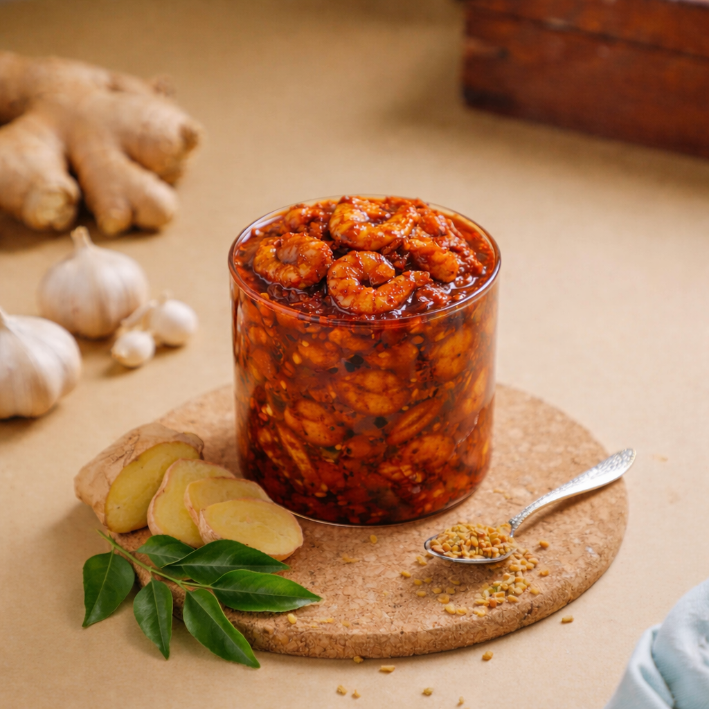 Our Telugu-style Prawn Pickle is made just the way it’s prepared back home – with juicy prawns, cold-pressed oil, garlic, mustard seeds, and a special blend of traditional spices that bring out that unforgettable coastal flavor.
